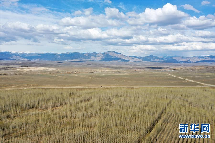 与阿勒泰市中水回用环境治理示范园林地一路之隔的就是戈壁滩(4月19日摄,无人机照片)。 近年来,新疆阿勒泰市利用经污水处理厂处理达标后的中水,灌溉建在戈壁滩上的苗圃基地,形成良性循环,助力绿化工程,改善生态环境。从2017年至今,阿勒泰市中水回用环境治理示范园已为当地绿化工程提供40万株树苗,实现5000亩荒山绿化。 新华社记者 丁磊 摄