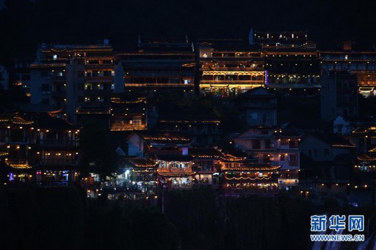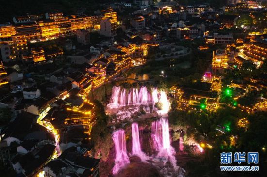 近日,湘西土家族苗族自治州永顺县芙蓉镇景区在做好疫情防控的情况下恢复开放。夜幕降临,景区内的瀑布、吊脚楼与灯光交相辉映,美不胜收,吸引许多游客前来休闲、参观。
