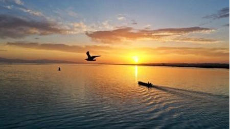 立秋过后,新疆博斯腾湖上渔民秋捕繁忙。位于新疆巴音郭楞蒙古自治州博湖县境内的博斯腾湖是我国最大的内陆淡水湖,也是新疆最大的渔业生产基地。博斯腾湖年产草鱼、鲢鱼、鲤鱼等32种鱼类约4000吨。图为8月8日,在新疆博斯腾湖,渔民驾驶渔船前往捕捞区域(无人机照片)。新华社发 年磊 摄