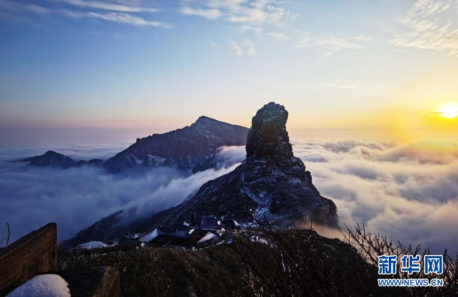1月17日在贵州铜仁梵净山拍摄的夕阳云海景观。
