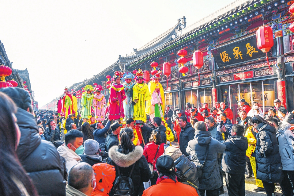 1月31日,游客在平遥古城观看民俗社火表演。元宵节临近,平遥古城内举行具有当地特色的民俗展演活动,热热闹闹迎元宵。