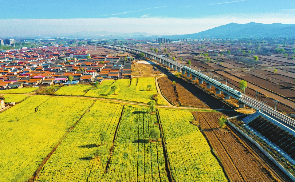 4月9日,长治市潞州区南垂村,金灿灿的油菜花海与村落、高铁列车交织成一幅乡村振兴的田园画卷,美不胜收。张海 张永清摄
