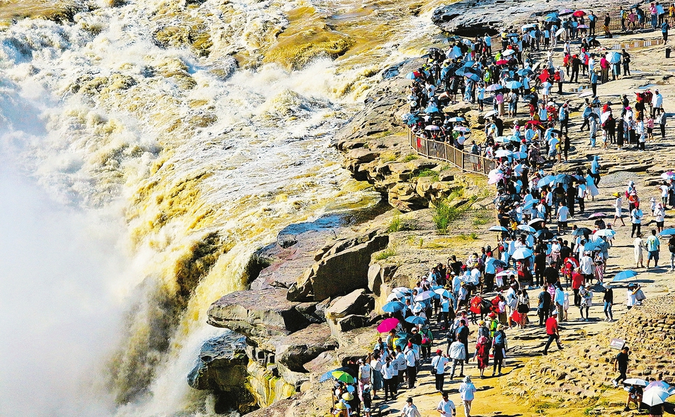 8月20日,游客在吉县黄河壶口瀑布游览观瀑。近期,黄河壶口瀑布水量增大,形成绵延200余米的特大瀑布群景观,气势磅礴,吸引了众多游客前来感受瀑布和黄河的雄浑之美。