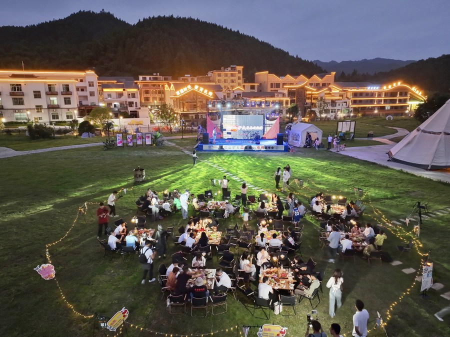 新华社南昌10月6日电(记者朱雨诺、程迪)夜幕之下,江西萍乡市武功山景区的驴友帐篷大本营内热闹非凡。喜爱音乐的游客在演出现场跟着歌曲旋律摇摆,也有不少游客三五成群,坐在天幕下边看电影边吃烧烤,享受着假期悠闲时光。