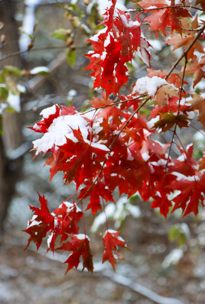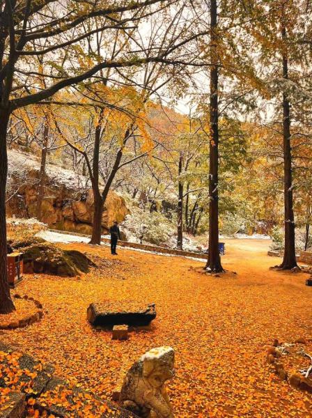 11月初,平度大泽山迎来初雪。皑皑的雪絮翩然旋落,缀在枝桠间,散在野地里,聚在石阶上,秋意正浓的山林披上了“银装”。金黄的杏叶流光溢彩,在萧瑟寒冬中,燃烧出一片片蓬勃向上的生机与活力。大泽山因细雪的馈赠,宛如人间仙境。