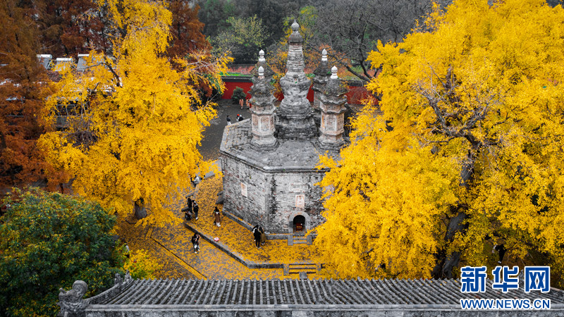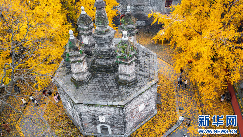 广德寺内的银杏树距今已有1500多年历史,被人们称为“将军树”。如今树叶变黄,“将军”犹如身披“金甲”。轻风拂过,银杏树叶随风飘落,铺满整个寺院,仿佛金黄的地毯,成为这个季节最美的风景,吸引了众多游客前来拍照打卡。(吴肖、刘梦灵)