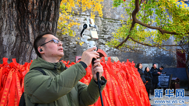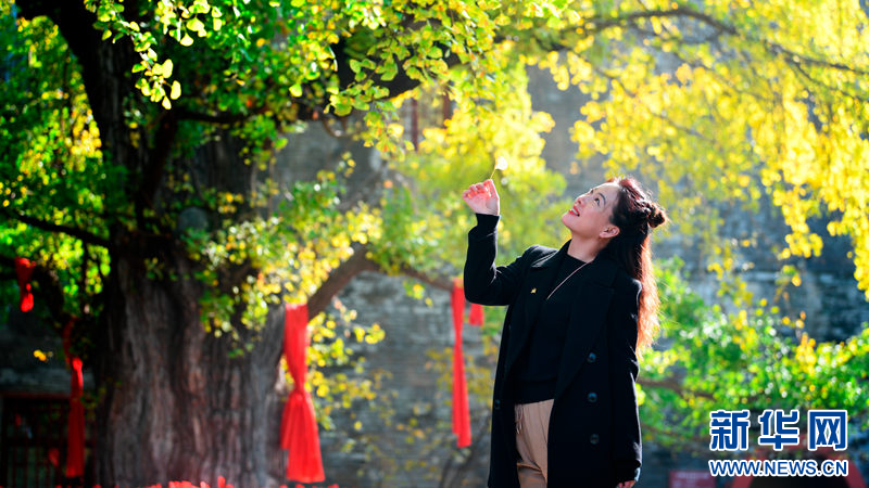 近日,伫立在湖北襄阳广德寺内的银杏古树迎来最佳观赏期,吸引了众多游客前来拍照打卡。 杨潇摄 新华网发