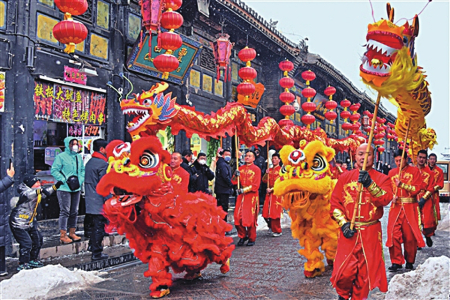 活动:社火演绎团队在中心广场表演,传统社火演绎锣鼓、秧歌、旱船、猪八戒背媳妇儿、喜庆小毛驴、刘三推车、大头娃娃、锣鼓、舞蹈、广场舞等表演。舞龙演绎团队在中心广场表演以及在复盛城及院内进行巡游表演,传承非遗文化,营造节日氛围,体现晋中民俗文化特色。春节期间来旅游,别忘了和工作人员行拱手礼,道一声“掌柜的新年快乐,恭喜发财!”有机会获赠乔院新年贺卡哦。在游客中心广场和复盛城街区,有“乔家少爷”特定时间给游客发乔家纪念品,引导游客参与各个环节的游戏及美食品鉴,赠送游客新春寻宝贺卡,与游客进行打卡互动拍摄,新春寻宝贺卡可以用来通过任务寻找商家集章,完成任务找到“乔家少爷”领取宝藏。
