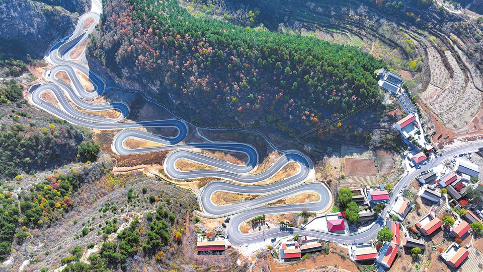 10月29日拍摄的太行一号旅游公路壶关县东柏坡段,宛如巨龙盘踞在五彩斑斓的群山间。该路段连通了太行山大峡谷5A级风景区等众多景区、景点和古村落,也因奇险峻美成为网红打卡地,成为当地文旅康养产业的快速路、致富路。