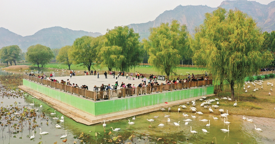 11月10日,运城市平陆县三湾黄河湿地,成群野生大天鹅在这里栖息越冬,吸引众多游客前来观赏,展现出一幅人与自然和谐相处的美丽生态画卷。近年来,平陆县持续推进黄河沿岸湿地生态治理与环境修复,拉动当地农文旅产业深度融合,助推县域经济高质量发展。