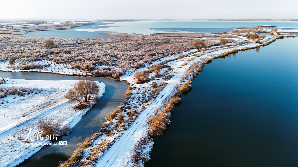 2024年11月22日至23日,新疆昌吉回族自治州呼图壁县迎来一场降雪。雪后的呼图壁县小海子湿地银装素裹,湖面半冰半水,交相辉映,成群的野鸭在湿地觅食嬉戏,一幅幅生态美景映入眼帘,美如画卷。陶维明摄(人民图片网)