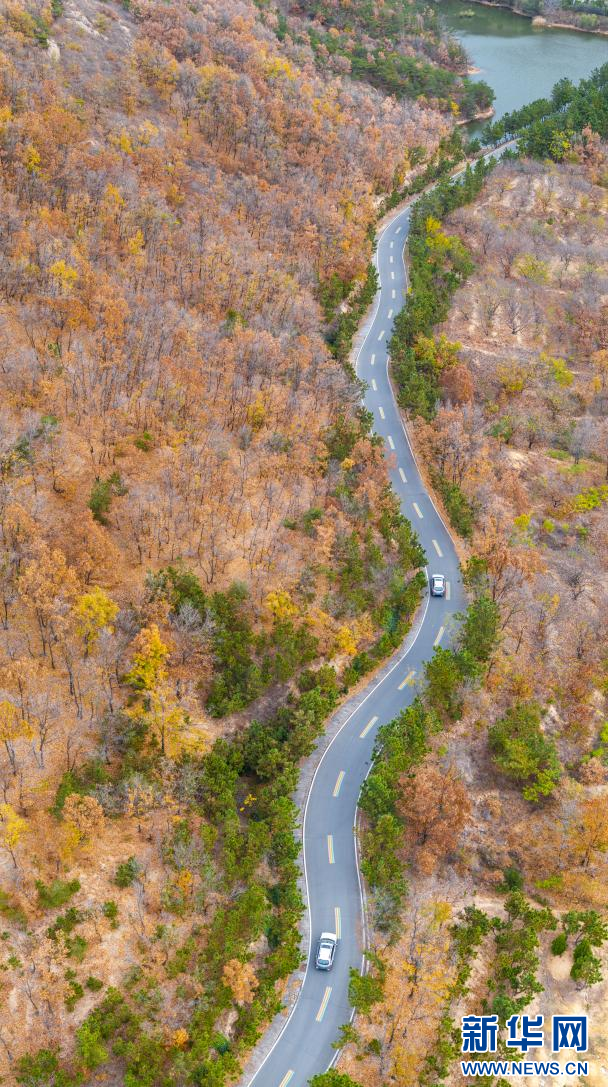 车辆行驶在九仙山景区的山路上(无人机照片)。新华网发(单英 摄)