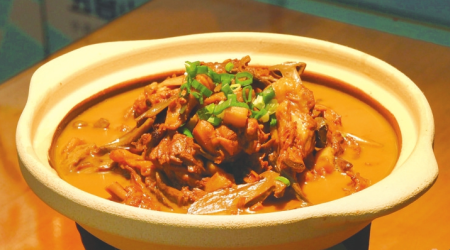 制作过程处处是讲究,先泡发台蘑、处理鸡块,用十几种调料煸炒鸡块,再与泡发好的台蘑小火慢炖40分钟,让山珍的鲜味与鸡肉的醇香充分融合,最后大火收汁。这道菜将台蘑鲜香与鸡肉醇厚完美平衡,汤汁浓郁不腻。
