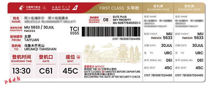 此次升级不仅注重文化表达,更着力提升服务体验。登机牌对登机口、起飞时间、座位号等关键信息进行了“放大提亮”处理,通过字体加粗、色彩对比等设计,显著提升了信息辨识度,特别方便老年旅客快速获取信息,有效降低误机风险,体现了东航精细化服务理念。