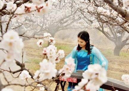 在近日举办的繁峙赵庄杏花节上,一名身穿古装的女子正在杏花烂漫的杏园里进行古筝弹奏表演。近年来,作为全国“一村一品”示范村的繁峙县赵庄村,种植杏树面积达5200亩。去年,全村出售白水大杏树苗40 万株、白水大杏150 万公斤,总收入达800 多万元,人均年收入达到13000 元。(乔伟 摄)