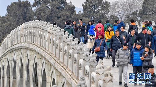 3月11日,大批游人在颐和园十七孔桥游玩。 新华社记者 李欣 摄