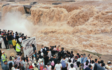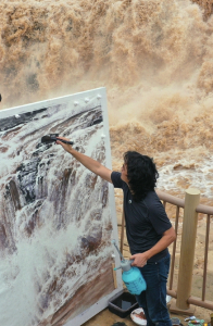8月10日,一名画家在吉县黄河壶口瀑布景区现场创作(左图)。连日来,吉县黄河壶口瀑布水量持续增大,形成壮美瀑布群景观,奔腾咆哮的雄姿吸引了众多书画爱好者前来创作。