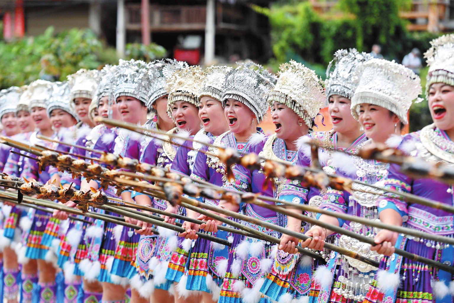近年来,广西柳州市融水苗族自治县充分利用当地资源,推动渔旅融合发展,助力乡村振兴。图为10月18日,村民们向游客展示刚刚烧好的鱼。 新华社记者 黄孝邦摄