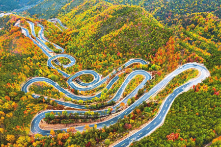 10月17日拍摄的左权县太行龙泉风景区景色。太行一号旅游公路北天池段,似长龙盘旋在五彩斑斓的太行秋色之中,峰回路转,风景秀丽,绘成一幅绝美的天然画卷,带领游客开启诗意之旅。