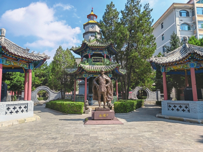 穿过大门,一座约3米高的古铜色左权将军塑像巍然屹立。将军身披军大衣,目光坚定地望向远方,仿佛仍在守护这片曾经战斗过的土地。塑像后方,苍松翠柏掩映着亭台廊庑,肃穆之感油然而生。