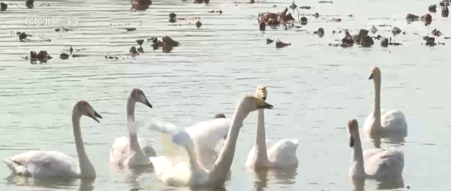 这些白色精灵时而转过头梳理羽毛,时而将修长的脖颈伸入水中觅食。不过,它们也并非总是相安无事。看这边,气氛有点紧张,为了争夺食物和地盘,这几只大天鹅面对着面,急速扇动着翅膀,试图吓退对方。