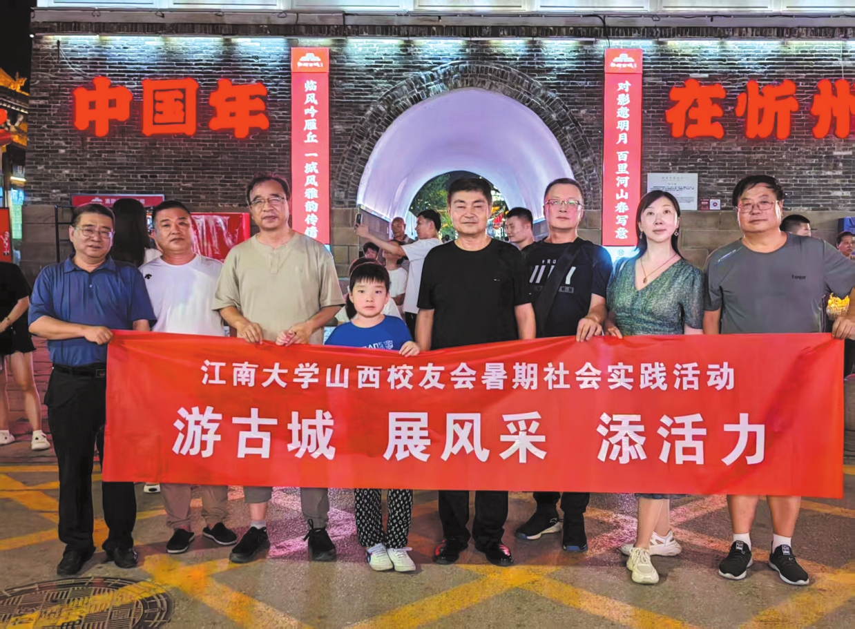 夏日的傍晚,落日熔金,忻州古城城楼如剪影般伫立,与暮色深沉交融。校友们沿着石板路缓缓前行,沿街仿古建筑的恢宏气势深深地吸引着大家。夜幕下的古楼在彩灯的映照下更显雄伟,校友们撑起“游古城展风采添活力”的红色会标合影留念,镜头记录下了我们相聚的宝贵瞬间。