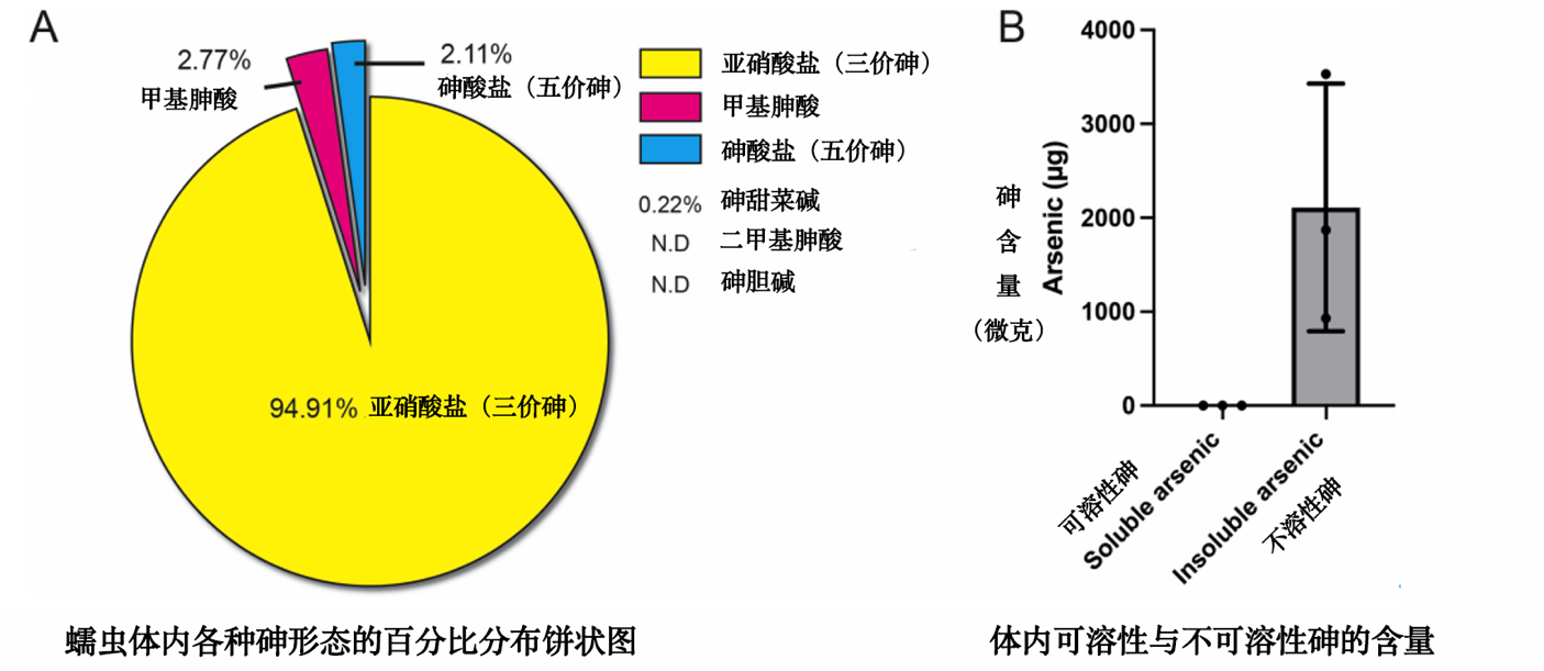 A:蠕虫体内各种砷形态的百分比分布;B:体内可溶性与不可溶性砷的含量