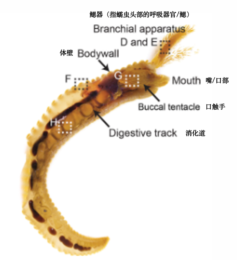 通过显微镜观察,科学家发现蠕虫的上皮细胞中充满了直径0.77-1.29微米的黄色颗粒。这些颗粒不仅存在于体表,还分布在鳃、口触手和消化道中——所有与海水直接接触的部位。