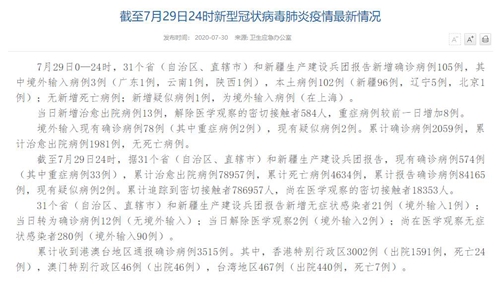 人民网北京7月30日电(董童)国家卫生健康委于今日在官网发布的《截至7月29日24时新型冠状病毒肺炎疫情最新情况》(以下简称“情况”)提出,7月29日0—24时,31个省(自治区、直辖市)和新疆生产建设兵团报告新增确诊病例105例,其中境外输入病例3例(广东1例,云南1例,陕西1例),本土病例102例(新疆96例,辽宁5例,北京1例);无新增死亡病例;新增疑似病例1例,为境外输入病例(在上海)。当日新增治愈出院病例13例,解除医学观察的密切接触者584人,重症病例较前一日增加8例。