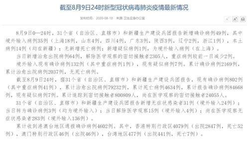 人民网北京8月10日电(董童)国家卫生健康委于今日在官网发布的《截至8月9日24时新型冠状病毒肺炎疫情最新情况》(以下简称“情况”)提出,8月9日0—24时,31个省(自治区、直辖市)和新疆生产建设兵团报告新增确诊病例49例,其中境外输入病例35例(上海18例,山东4例,四川4例,广东3例,陕西3例,辽宁2例,浙江1例),本土病例14例(均在新疆);无新增死亡病例;新增疑似病例1例,为境外输入病例(在上海)。当日新增治愈出院病例64例,解除医学观察的密切接触者2305人,重症病例较前一日减少2例。