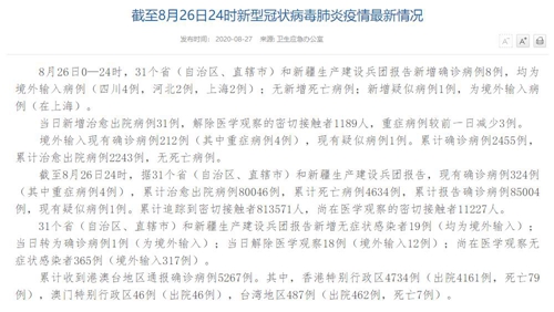 人民网北京8月27日电(董童)国家卫生健康委于今日在官网发布的《截至8月26日24时新型冠状病毒肺炎疫情最新情况》(以下简称“情况”)提出,8月26日0—24时,31个省(自治区、直辖市)和新疆生产建设兵团报告新增确诊病例8例,均为境外输入病例(四川4例,河北2例,上海2例);无新增死亡病例;新增疑似病例1例,为境外输入病例(在上海)。当日新增治愈出院病例31例,解除医学观察的密切接触者1189人,重症病例较前一日减少3例。