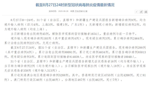 人民网北京8月28日电(董童)国家卫生健康委于今日在官网发布的《截至8月27日24时新型冠状病毒肺炎疫情最新情况》(以下简称“情况”)提出,8月27日0—24时,31个省(自治区、直辖市)和新疆生产建设兵团报告新增确诊病例9例,均为境外输入病例(四川4例,上海3例,福建1例,广东1例);无新增死亡病例;新增疑似病例2例,均为境外输入病例(均在上海)。当日新增治愈出院病例45例,解除医学观察的密切接触者1654人,重症病例与前一日持平。