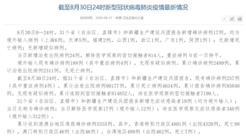 人民网北京8月31日电(董童)国家卫生健康委于今日在官网发布的《截至8月30日24时新型冠状病毒肺炎疫情最新情况》(以下简称“情况”)提出,8月30日0—24时,31个省(自治区、直辖市)和新疆生产建设兵团报告新增确诊病例17例,均为境外输入病例(上海6例,天津5例,福建2例,山西1例,浙江1例,广东1例,陕西1例);无新增死亡病例;无新增疑似病例。当日新增治愈出院病例24例,解除医学观察的密切接触者814人,重症病例与前一日持平。