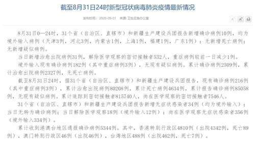 截至8月31日24时,据31个省(自治区、直辖市)和新疆生产建设兵团报告,现有确诊病例216例(其中重症病例3例),累计治愈出院病例80208例,累计死亡病例4634例,累计报告确诊病例85058例,无现有疑似病例。累计追踪到密切接触者815740人,尚在医学观察的密切接触者7546人。