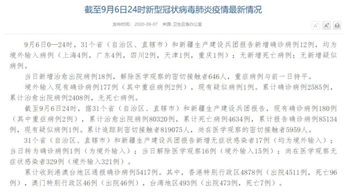 人民网北京9月7日电(董童)国家卫生健康委于今日在官网发布的《截至9月6日24时新型冠状病毒肺炎疫情最新情况》(以下简称“情况”)提出,9月6日0—24时,31个省(自治区、直辖市)和新疆生产建设兵团报告新增确诊病例12例,均为境外输入病例(上海4例,广东4例,四川2例,天津1例,重庆1例);无新增死亡病例;无新增疑似病例。当日新增治愈出院病例18例,解除医学观察的密切接触者646人,重症病例与前一日持平。
