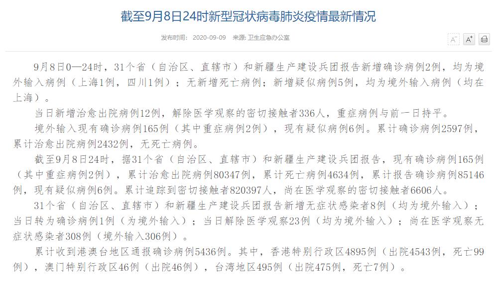 情况显示,截至9月8日24时,据31个省(自治区、直辖市)和新疆生产建设兵团报告,现有确诊病例165例(其中重症病例2例),累计治愈出院病例80347例,累计死亡病例4634例,累计报告确诊病例85146例,现有疑似病例6例。累计追踪到密切接触者820397人,尚在医学观察的密切接触者6606人。