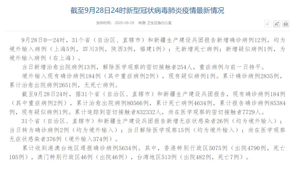 人民网北京9月29日电(董童)国家卫生健康委于今日在官网发布的《截至9月28日24时新型冠状病毒肺炎疫情最新情况》(以下简称“情况”)提出,9月28日0—24时,31个省(自治区、直辖市)和新疆生产建设兵团报告新增确诊病例12例,均为境外输入病例(上海5例,四川3例,陕西3例,福建1例);无新增死亡病例;新增疑似病例1例,为境外输入病例(在上海)。当日新增治愈出院病例13例,解除医学观察的密切接触者254人,重症病例与前一日持平。