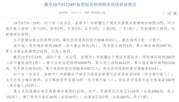 人民网北京10月10日电(许晓华)国家卫生健康委于今日在官网发布的《截至10月9日24时新型冠状病毒肺炎疫情最新情况》(以下简称“情况”)提出,10月9日0—24时,31个省(自治区、直辖市)和新疆生产建设兵团报告新增确诊病例15例,均为境外输入病例(四川5例,陕西3例,天津2例,辽宁2例,上海2例,广东1例);无新增死亡病例;无新增疑似病例。当日新增治愈出院病例15例,解除医学观察的密切接触者857人,重症病例与前一日持平。