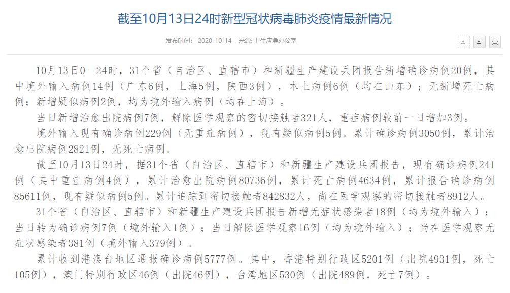 人民网北京10月14日电(董童)国家卫生健康委于今日在官网发布的《截至10月13日24时新型冠状病毒肺炎疫情最新情况》(以下简称“情况”)称,10月13日0—24时,31个省(自治区、直辖市)和新疆生产建设兵团报告新增确诊病例20例,其中境外输入病例14例(广东6例,上海5例,陕西3例),本土病例6例(均在山东);无新增死亡病例;新增疑似病例2例,均为境外输入病例(均在上海)。当日新增治愈出院病例7例,解除医学观察的密切接触者321人,重症病例较前一日增加3例。