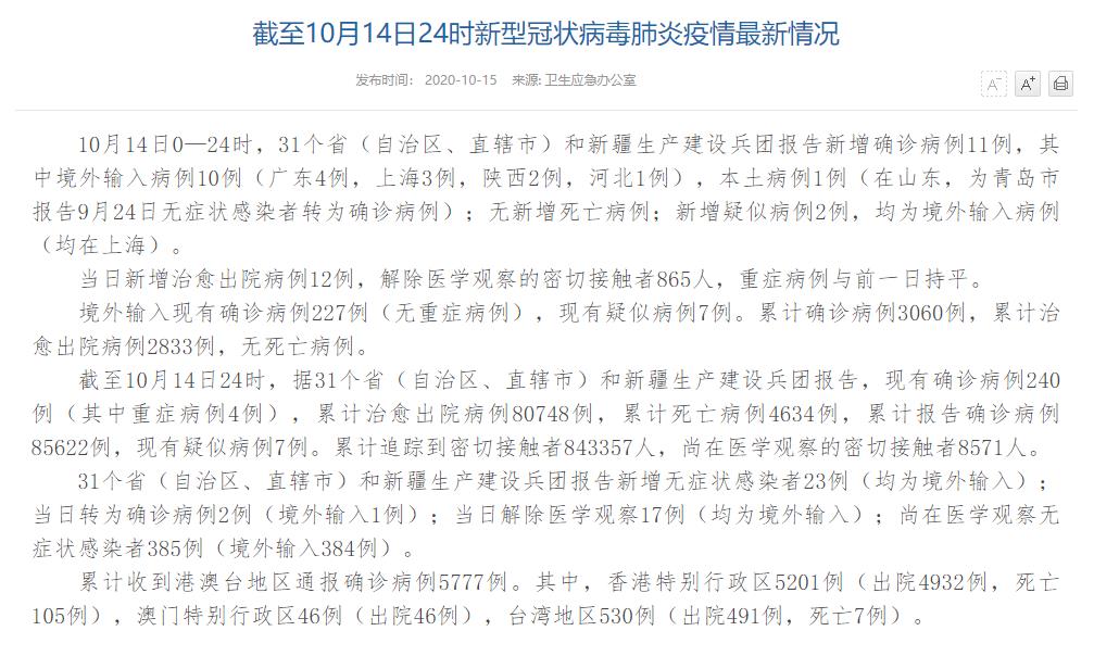 人民网北京10月15日电(董童)国家卫生健康委于今日在官网发布的《截至10月14日24时新型冠状病毒肺炎疫情最新情况》(以下简称“情况”)提出,10月14日0—24时,31个省(自治区、直辖市)和新疆生产建设兵团报告新增确诊病例11例,其中境外输入病例10例(广东4例,上海3例,陕西2例,河北1例),本土病例1例(在山东,为青岛市报告9月24日无症状感染者转为确诊病例);无新增死亡病例;新增疑似病例2例,均为境外输入病例(均在上海)。当日新增治愈出院病例12例,解除医学观察的密切接触者865人,重症病例与前一日持平。