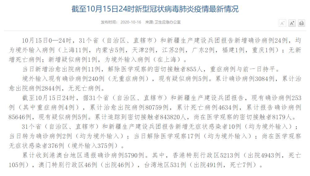 人民网北京10月16日电(董童)国家卫生健康委于今日在官网发布的《截至10月15日24时新型冠状病毒肺炎疫情最新情况》(以下简称“情况”)提出,10月15日0—24时,31个省(自治区、直辖市)和新疆生产建设兵团报告新增确诊病例24例,均为境外输入病例(上海11例,内蒙古5例,天津2例,江苏2例,广东2例,福建1例,重庆1例);无新增死亡病例;新增疑似病例1例,为境外输入病例(在上海)。当日新增治愈出院病例11例,解除医学观察的密切接触者855人,重症病例与前一日持平。