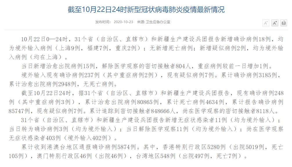 人民网北京10月23日电(董童)国家卫生健康委于今日在官网发布的《截至10月22日24时新型冠状病毒肺炎疫情最新情况》(以下简称“情况”)提出,10月22日0—24时,31个省(自治区、直辖市)和新疆生产建设兵团报告新增确诊病例18例,均为境外输入病例(上海9例,福建7例,重庆2例);无新增死亡病例;新增疑似病例2例,均为境外输入病例(均在上海)。当日新增治愈出院病例15例,解除医学观察的密切接触者804人,重症病例较前一日增加1例。