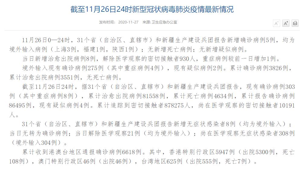 人民网北京11月27日电(董童)国家卫生健康委于今日在官网发布的《截至11月26日24时新型冠状病毒肺炎疫情最新情况》(以下简称“情况”)指出,11月26日0—24时,31个省(自治区、直辖市)和新疆生产建设兵团报告新增确诊病例5例,均为境外输入病例(上海3例,福建1例,陕西1例);无新增死亡病例;无新增疑似病例。当日新增治愈出院病例8例,解除医学观察的密切接触者930人,重症病例较前一日增加1例。