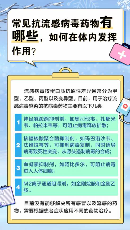 冬季气温骤降,流感来势汹汹。流感是一种由流感病毒引起的急性呼吸道传染病,在人群中有较高的发病率。流感患者通常会出现发热、咳嗽或咽痛等症状。部分症状较重的患者还会感到头痛、恶心、肌肉酸痛,甚至出现肺炎等并发症,需要及时就医用药治疗。那么,常见的抗流感药物有哪些?抗病毒药物治疗的最佳时间是什么?怎样服药更科学有效?本期请到中国医科大学附属第一医院感染性疾病一科主任张静萍教授为大家解疑释惑。