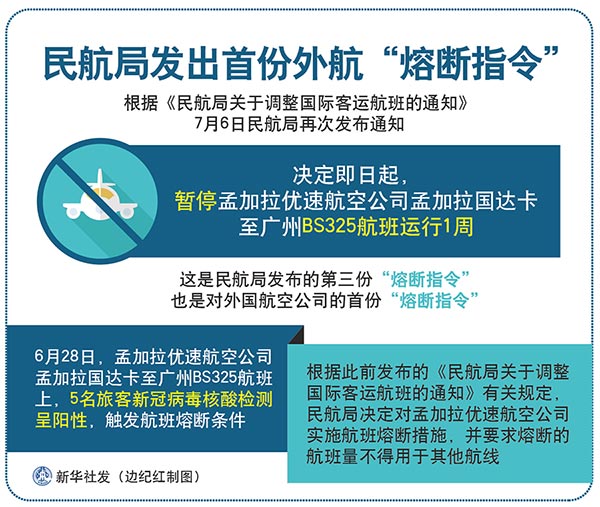 新华社北京7月6日电(记者齐中熙)根据《民航局关于调整国际客运航班的通知》,6日民航局再次发布通知,决定即日起,暂停孟加拉优速航空公司孟加拉国达卡至广州BS325航班运行1周。这是民航局发布的第三份“熔断指令”,也是对外国航空公司的首份“熔断指令”。