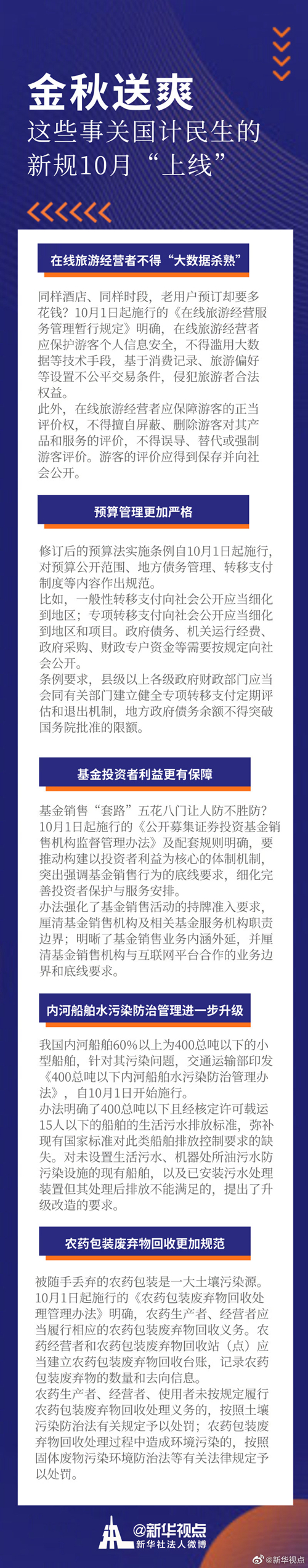 新华社北京9月29日电 题:金秋送爽,这些事关国计民生的新规10月“上线”