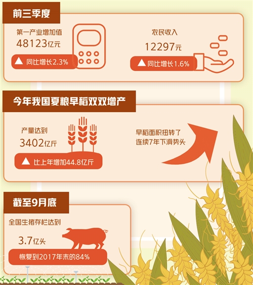 数据显示,前三季度我国第一产业增加值48123亿元,同比增长2.3%;农民收入12297元,同比增长1.6%。农业生产形势较好,成为国民经济运行的突出亮点,“三农”压舱石作用更加凸显,为稳定经济社会发展大局提供了有力支撑。