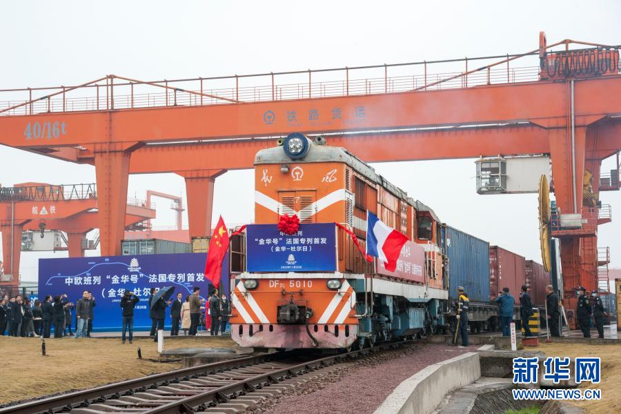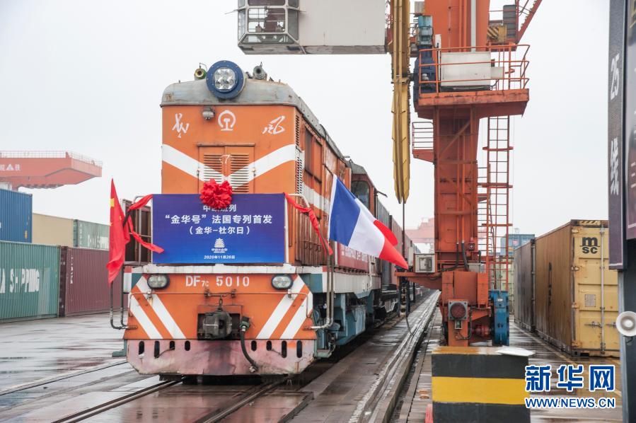 11月26日,载有82标准箱出口货物的X8020/19次列车从浙江金华南站启程驶往法国杜尔日。新华社发(胡肖飞 摄)