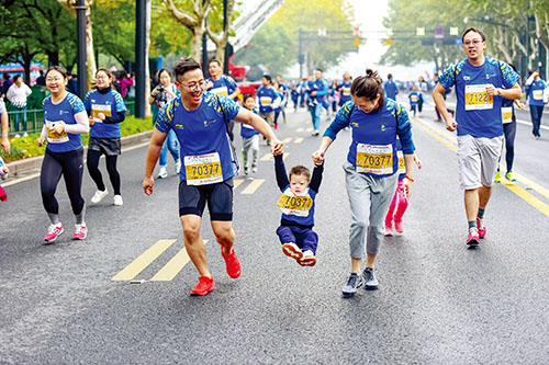 11月4日,多地举办马拉松比赛,众多长跑爱好者参与其中,享受运动带来的快乐。图为家长带着孩子参加浙江杭州举行的马拉松比赛。据新华社 徐晖 摄