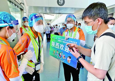9月14日,在西安咸阳机场,工作人员为参加全运会的记者提供服务。本报记者 郭红松摄/光明图片